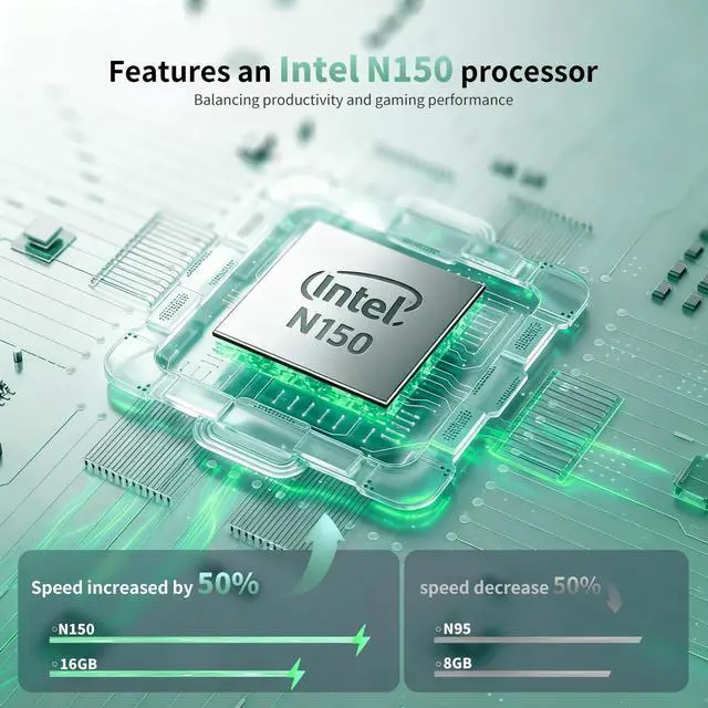 ^^ Powerful Performance: Equipped with the latest N150 processor (up to 3.6GH z), 16GB RAM and 512GB SSD. Experience lightning-fast boot-ups, quick file transfers, and seamlessly switch between multiple apps.