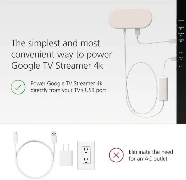 Enjoy a seamless streaming setup without the usual clutter or hassle. Our specialized USB power cable for Google TV (Streamer 4K Version) taps directly into your TVs USB port, eliminating the need for an AC outlet and freeing your space from extra wires and adapters. Engineered with advanced power management circuitry, it intelligently stores excess energy from the USB port and releases it as neededensuring smooth, uninterrupted viewing even when your Google TV demands peak power. Designed at the perfect length to keep your entertainment space organized, this cable easily connects your streaming device to your TVs side USB and HDMI ports.