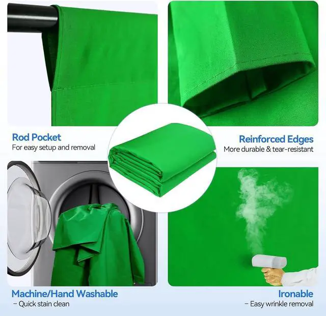 10x12ft Green Screen Backdrop: All edges are carefully finished preventing tears in the material, and should it become stained. The fabric muslin can be dry-cleaned or even machine washed.