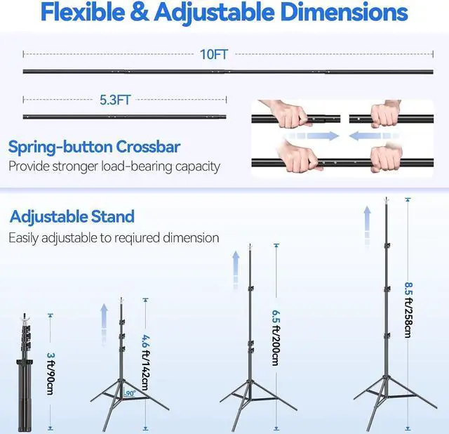 Quick Setup & Adjustable: The green screen stand can be assembled by one person in just a few minutes. This kit is a professional support with Adjustable Height( Min 3 ft Max 8.5 ft ) and Width ( Min 5 ft Max 10 ft ) Aluminum Alloy Construction for Durability, Portability.