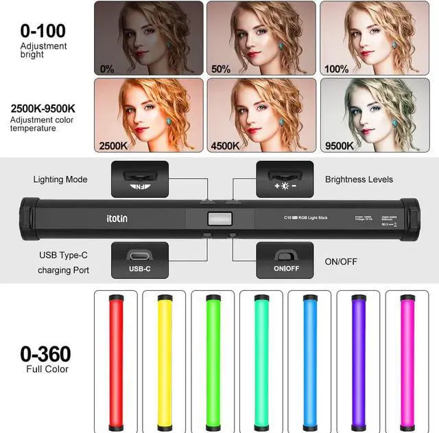RGB Full Color Light Wand: The rgb photography light stick has has 153 high brightness and quality RGB light beads. Color temperature range from 2500K to 9500K. High color reproduction, CRI97, TLCL97, LUX=1100 LM. The brightness level can be changed from 0-100%. 3 general lighting + 9 RGB color modes, 9 pre-set lighting modes (RGB cycle, police car, ambulance, fire truck, lightning, candle, fireworks, flame, strobe), easily create different atmospheres.