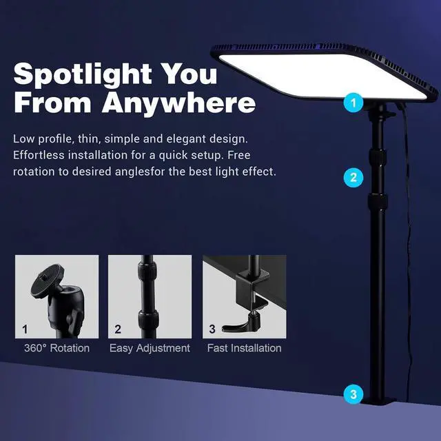 Extendable Desk StandFeaturing a super- efficient cooling system, ES45 Kit keeps the heat impressively low. You can enjoy long-hour streaming with a comfortable and neat ambience. The light is built to last with solid metal while keeping incredible slim and space-saving. Effortless installation for a quick setup. Free rotation to desired angles for the best light effect.