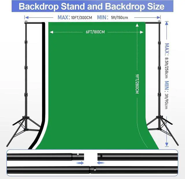 8.5 x10ft Backdrop Support SystemThe backdrop support system includes three 6x9ft muslin backdrops (black/white/green). Easily adjust the height from 2.6 ft to 8.5 ft and an expand the width from 5.2 ft to 10ft-perfect for heavy canvas, muslin, and paper backdrops. Ideal for studio portraits, product photography, and video shoots.