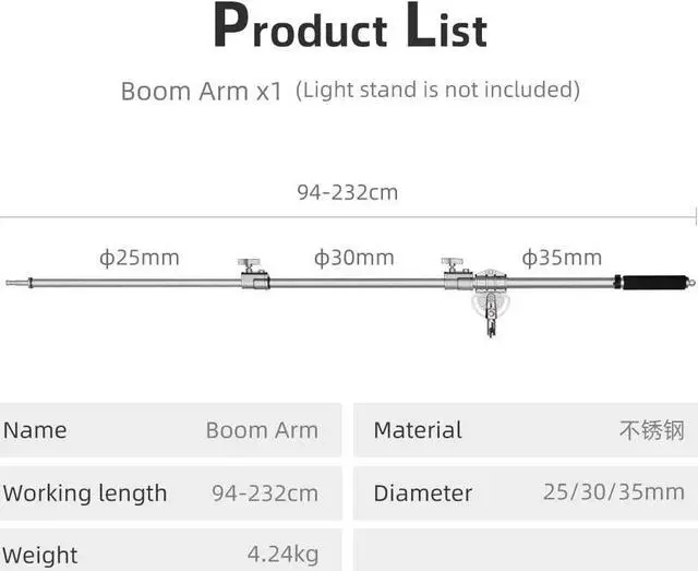 This boom arm is made of stainless steel. Ideal for studio or rental shooting and is ideal for backlights or hair lights