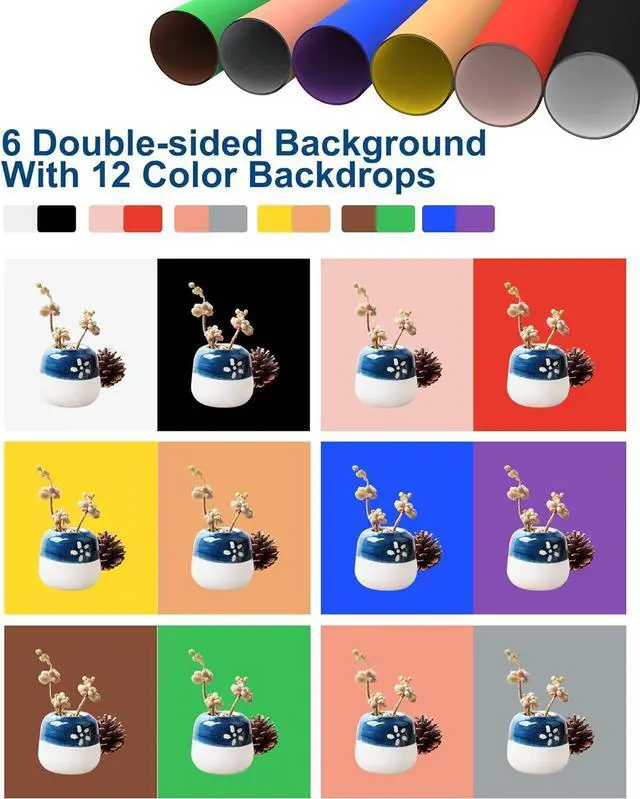3-color Temperature Adjustment, 12-color BackgroundColor temperature is adjustable from 3200-6500K, 10-level (1% to 100%) adjustable photography box; 6 sheets of double-sided color removable background paper, 12 color background colors to meet various shooting scenes.