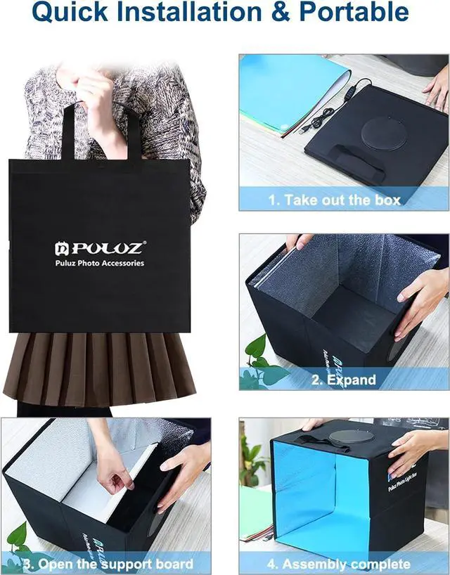 Foldable, Portable and Easy to AssembleThe professional shooting tent adopts a portable and foldable design for quick installation. With USB Type-C cable design and storage bag, compact and easy to store, convenient for you to use and carry at any time.