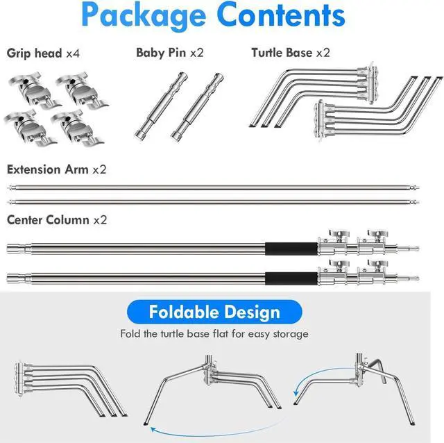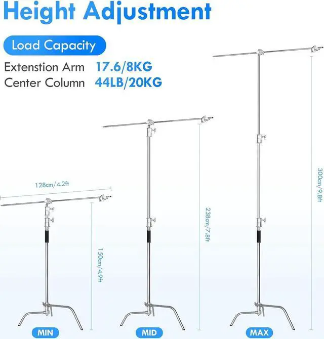 Heavy-Duty Stand& Versatile FunctionThis photography C-stand made of high-quality stainless steel, the C-stand with refined design serves long-lasting durability for supporting heavy-duty photographic gears