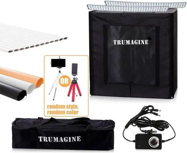 Contents: 1x 24x24x24inch Shooting tent, 1x Translucent Cloth, 3x PVC backdrops [black, white, yellow], 2x LED Beads Strips, 2x Dimmer Switch, 1x Phone Tripod with Clamp, 1xCarry bag. --If you have any questions, please send us an email and we will solve it for you immediately.