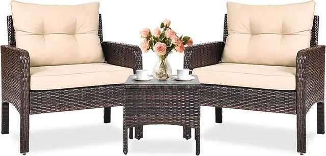 Versatile Outdoor Furniture SetThis patio conversation set includes 2 rattan chairs and 1 coffee table, which creates a cozy area to relax or enjoy a cup of coffee with your family or friends. This 3-piece patio furniture set is a great addition to the patio, garden, balcony or poolside.