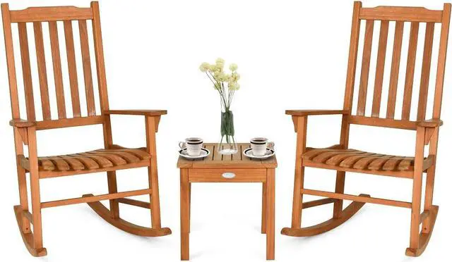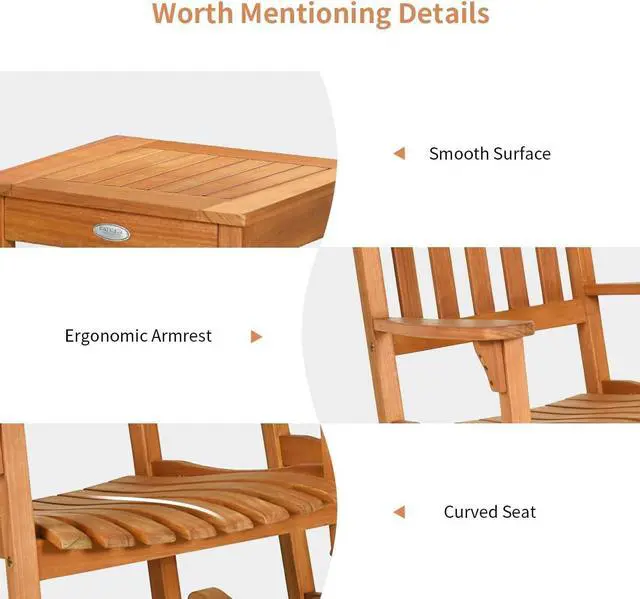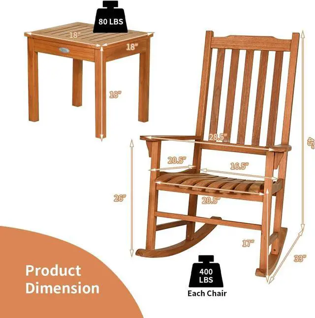 Solid Eucalyptus Wood: This patio conversation set is constructed of solid eucalyptus wood with uniform color, making all of them stand the test of time and come with steady performance. Each rocking chair holds up to 400 lbs and the coffee table supports up to 80 lbs.