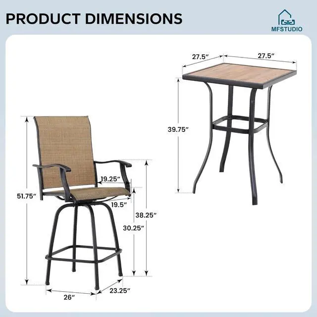 Swivel Outdoor Bar Stool: Experience ease of movement with our swivel tall patio table and chairs. Enjoy conversations and views with friends effortlessly at your high top patio table and chairs set for 2