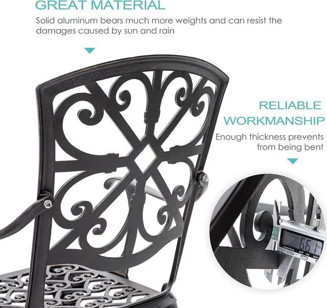 ALUMINUM FRAME: The frame made of high-quality aluminum with black spray-painted gold paint powder coating protects the outdoor patio bistro sets 3 piece from getting rust all weather and ensures the round dining table set durability for years to come