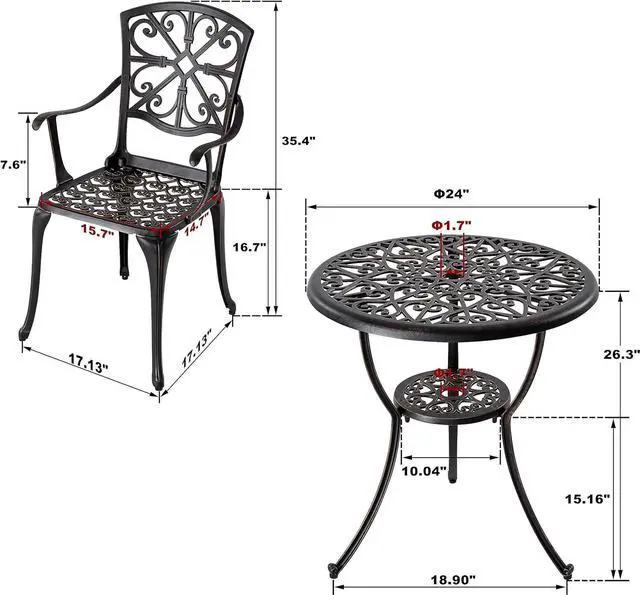 NUU GARDEN BISTRO SET: The cast aluminum 3 piece bistro set outdoor has a 1.77 " umbrella hole which fits most patio umbrellas and a holder for fixing the umbrella. Outdoor table and chairs takes you on a relaxing holiday in deck, yard, balcony, garden, lawn, front porch, pool