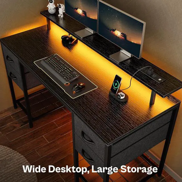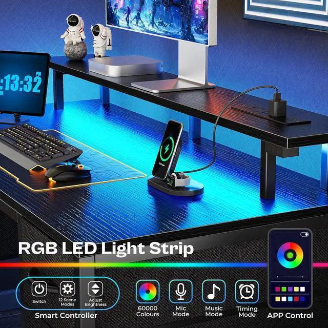 Gaming Desk with LED Lights- The RGB LED lighting on the black desk offers a vivid, immersive atmosphere, ideal for gaming and working. With 12 scene modes, adjustable speed and 3 brightness levels, it' s easily controlled by the smart controller on the LEDs. You can also access over 60, 000 colors, timing mode, or sync with mic/music mode via app to follow your favorite rhythms.