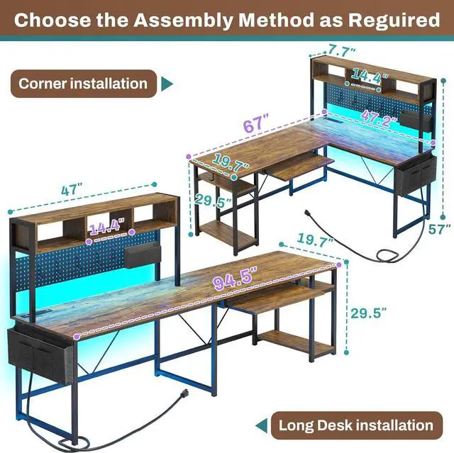 Reversible DeskReversible 67 inch corner desk or 94.5 inch long office desk: L Shaped desk is perfect for tucking into a corner, it can hold your computer, monitor, keyboard, files, books or CPU stand for home office. Or 94.5 inch two person desk can hold two-person studying or writing no interference. And the top hutch can place left or right for your needs.