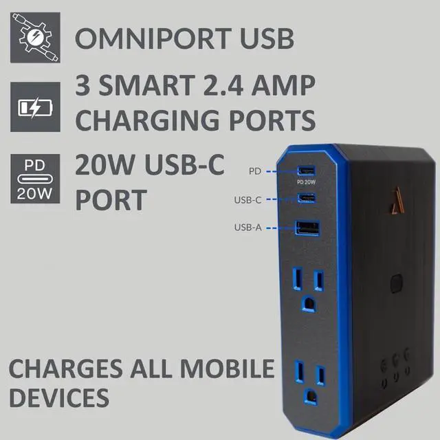 3 FAST CHARGING PORTS: 1 USB-A; 2 USB-C delivering up to 2.4 Amps, protecting all low-voltage devices & a 20W USB-C PD port