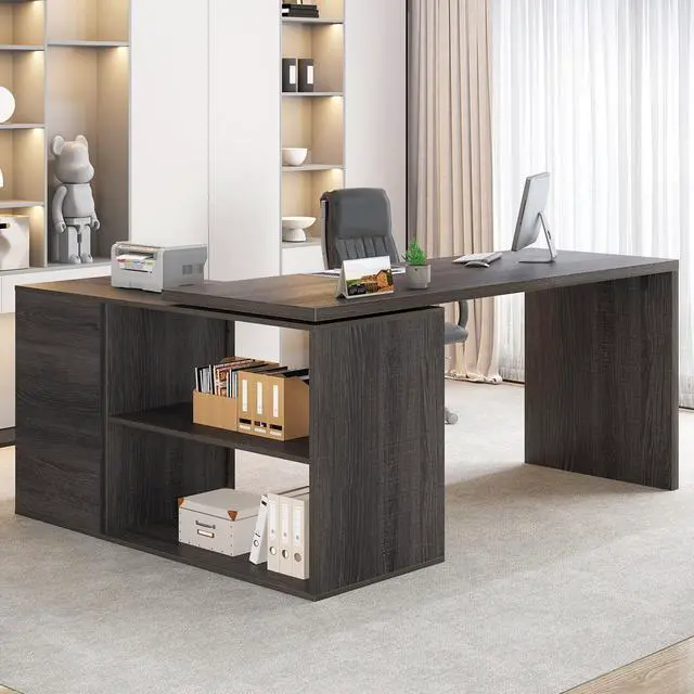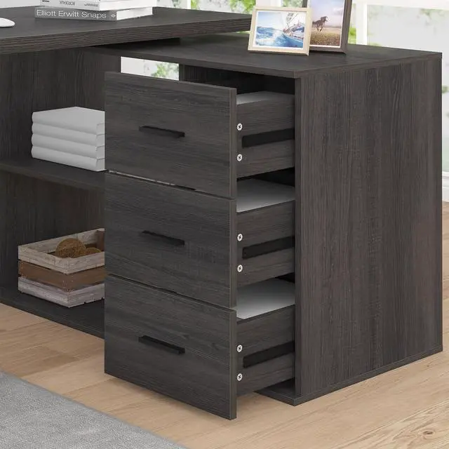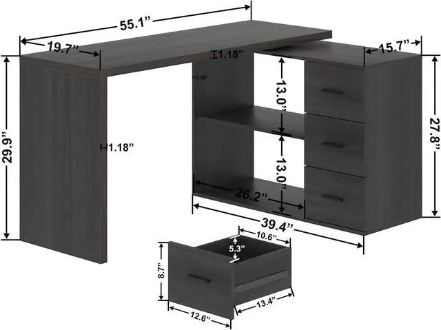 Keep Clutter out of Sight and out of Mind: The 2 open long shelves of the L shaped desk provide a place for essential office supplies at arms reach, while the 3 drawers let you tuck away anything from loose odds and ends to important files. The shelves and drawers of the L shaped computer desk maximally utilize your home office and provide enough space for storage.