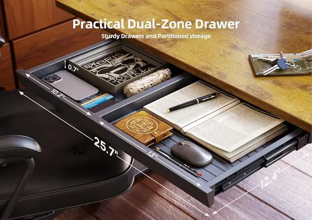 Reasonable Drawer Compartment Design: Height adjustable desk adopts 25.6 inches× 11.8 inches plastic drawers and 10.2 inch and 13 inch width compartment design, It easily accommodates a 14 inch laptop or Pad and allows you to effectively utilize space