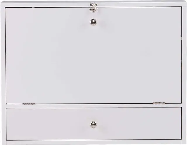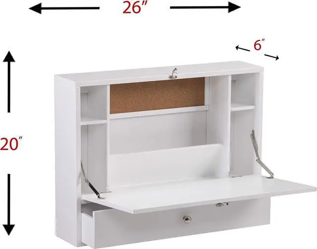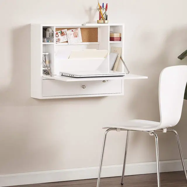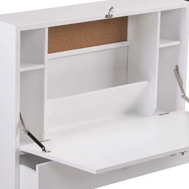 Wall mounted desk features four compartments, one angled paper organizer, one corkboard, one drawer, and a fold-down desktop