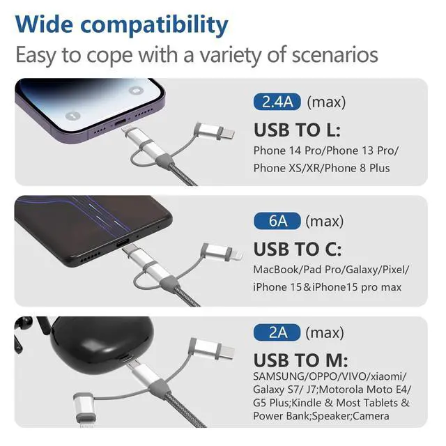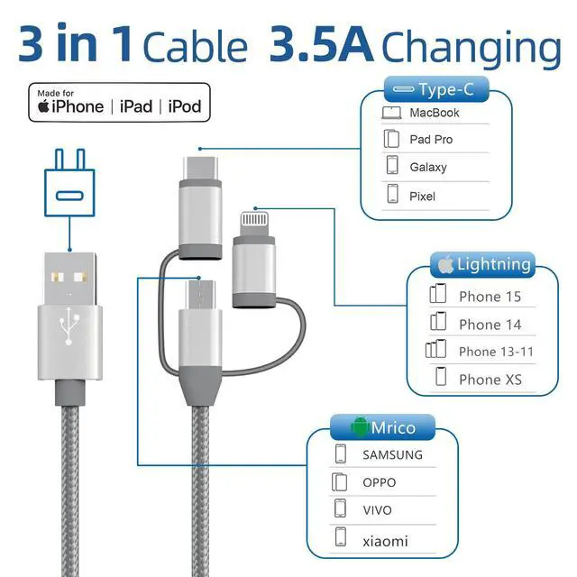 Charging Cable: Experience ultimate convenience with our MICFLIP 3 in 1 Charging Cable Adapter, featuring Lightning, Type-C, and Micro USB tips in a single, lightweight design. Perfect for home, office, car play, or travel, this multi charging cable eliminates the need for multiple charging cords for multiple devices. ^^ Suitable to Connect DevicesThis versatile multi charging cable is compatible with iPhone 16/15/14, iPad, Huawei, HTC, LG, Samsung Galaxy, Sony Xperia, and many other Android smartphones. Enjoy high-speed data transfer rates of up to 480Mbps, making it simple to share music, photos, and files seamlessly between your devices. ^^ Suitable LengthThe 3.4 ft/1 meter length of this multi charging cable meets your daily charging needs without creating storage issues associated with longer cables. Its compact size makes it incredibly convenient to carry, whether you're at home or on the go. ^^ Durable MaterialsConstructed from high-quality fiber material, this 3 in 1 Charging Cable is designed for flexibility and durability. The specially woven fiber shell can withstand over 10, 000 bends, while the aluminum protection head provides heat and corrosion resistance, ensuring a longer service life.