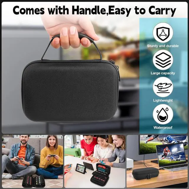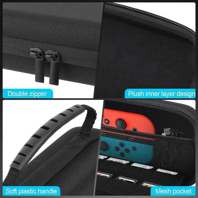 Sturdy and durable semi-hard shell provides ultimate protection.Comes with a handle for convenient carrying.The internal elastic mesh pocket can increase the usable space. In addition to game cards, you can also put some small items in the mesh pocket.