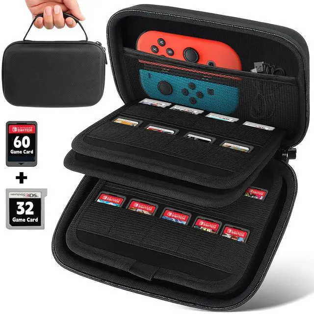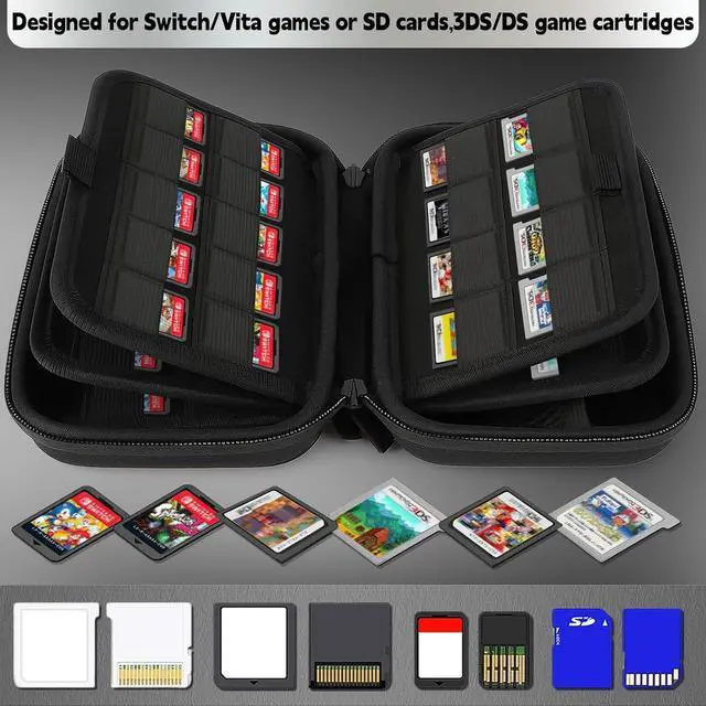 This nintendo switch game case can hold 32 pcs 3ds game cards and 60 switch game cards.Compatible with Nintendo 3DS, 3DS XL,New 2DS XL,2DS, DSi, Switch/Nintendo Switch, PS Vita Games.One game case that can hold both 3ds and switch game cases.