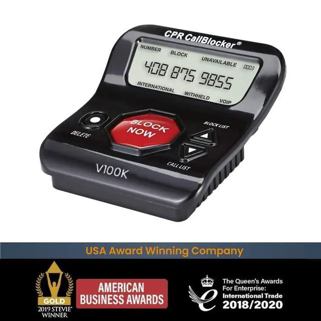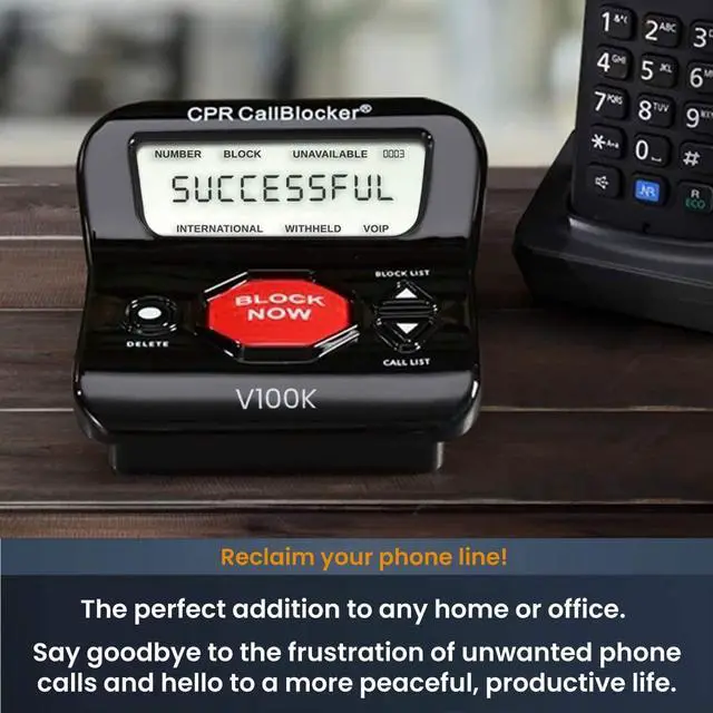 calls: block all at the touch of a button! The CPR V100K Call Blocker features a 3 inch caller display screen, large "Block Now" Button, 110, 000 Number capacity and has the ability to block unwanted callers from cordless DECT extension handsets by pressing #2.