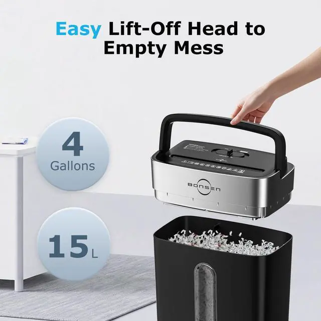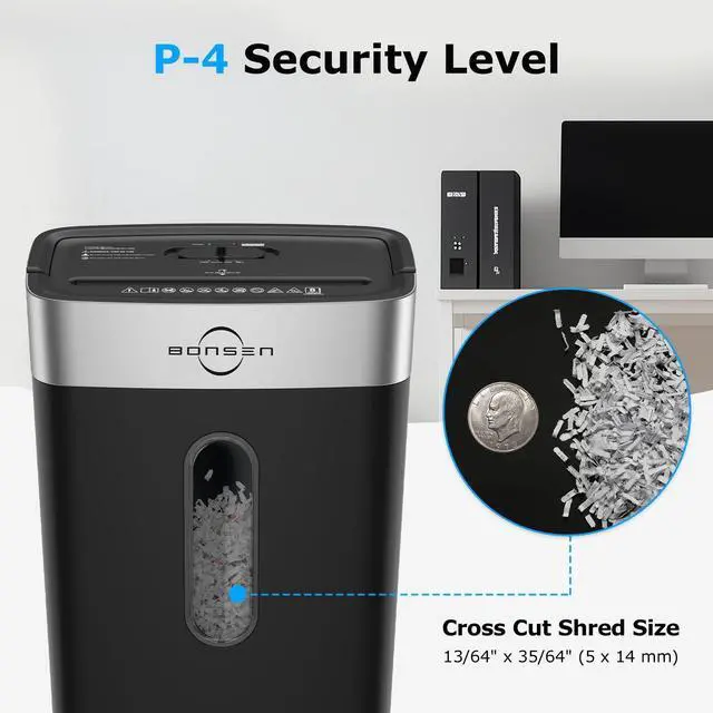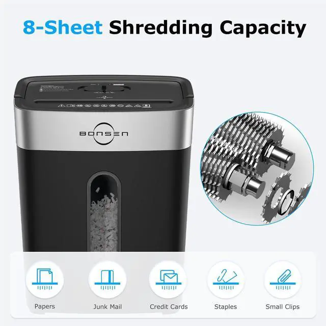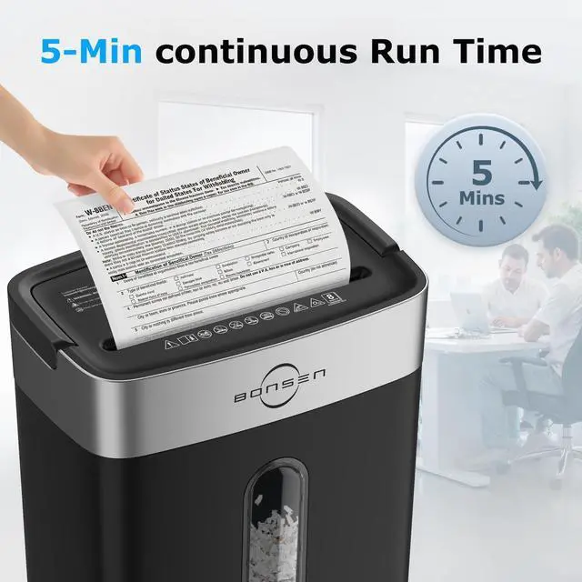 lbsCapacity: 4 GallonsProduct Features5-Minute Continuous Run TimeBONSEN paper shredder for home shreds continuously up to 5 minutes before a 30-minute cool down period is needed, allowing you to shred up to 230 sheets of 20 lb. bond paper at a time. 8-Sheet Shredding CapabilityBONSEN shredders for home use provide powerful shredding for paper (letter size, 75g), credit cards (one at a time), staples and small paper clips. P-4 Security LevelBONSEN paper shredder for home office shreds 8 sheets per pass into 13/64'' x 35/64'' (5 x 18 mm) cross cut particles. Also meets security level P-4 standards, keeping your confidential documents safe. 4-Gallon Bin & Lift-Off HandleBONSEN home paper shredder is designed with a 4-gallon bin that neatly contains over 210 shredded sheets; Also features a lift-off handle for easy emptying. Safety ProtectionExtra safety protection ensures this home shredder will operate only if the shredder head and the basket are both in correct position.. Overheating Protection & Anti-Jam SystemBONSEN paper shredder for home use is equipped with 4 mode control switch (Forward, Auto, Off, Reverse) and LED light indicators (Power On, Overheat).