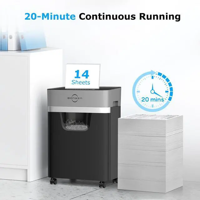 Continuous Shredding Power: Equipped with an advanced patented cooling system, BONSEN home office paper shredder can run continuously for up to 20 minutes, shredding up to 1, 400 sheets of paper in one session. After heavy-duty tasks, it automatically enters 30-minute cooldown mode to protect internal components, ensuring long-lasting durability for daily office or home use.