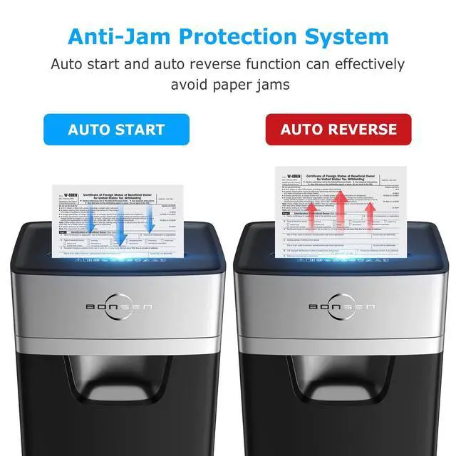 JAM PROOF AND EASY OPERATION: The heavy duty shredder is equipped with auto start and auto reverse functions to eliminate paper jam. Easy operation with light indication, overheating and overload protection to help you use and prolong shredder's service life ^^ LARGE CAPACITY BIN AND TRANSPARENT WINDOW: 5.3 gallons pull-out wastebasket can hold about 420 sheets of paper for less emptying; The transparent window makes it easy to see that the bin is full; Reduce the occurrence of paper scraps getting caught in the knives and causing paper jams ^^