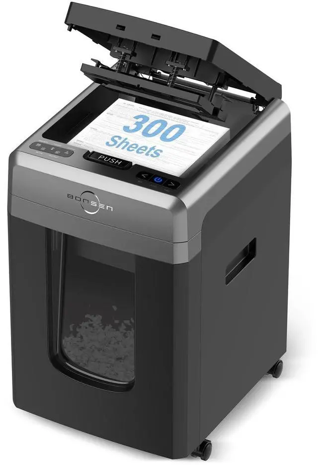 Auto-Feed Capacity: Effortlessly shred huge stacks of up to 300 sheets automatically; Plus, use the manual slot for 12 sheets or staples, paper clips, credit cards, and CDs/DVDs with ease ^^