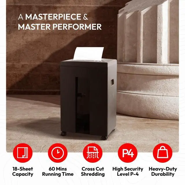 Heavy-Duty Performance: Quickly shreds up to 18 sheets of paper at once into 5/32 x 1-27/32 confetti-style particles. This shredding machine easily tackles staples, cardboard, credit cards, CDs, and small paper clips. The 60-minute continuous run time handles all of your document disposal needs! ^^