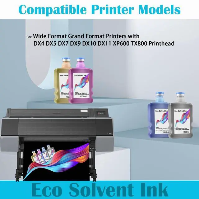 Applicable model:Eco Solvent Ink is compatible with DX4 DX5 DX7 DX9 DX10 DX 11 XP600 TX800 Printhead(Will Not Work for Eco tank Or Small Desktop Printers)
