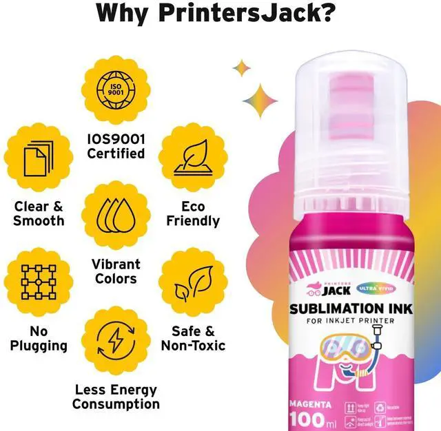 Spills: Say goodbye to messy refills with our Auto-Fill & Auto-Stop feature. Simply slot our bottles into your printer's ink inlet for automatic filling that stops on its own, preventing any spills or leaks. Spend less time on maintenance and more time creating! ^^ Exquisite Offering & Widely UsedPrinters Jack Sublimation Ink is versatile, ideal for creating intricate fonts, vibrant cartoon patterns, and designs on a variety of items such as T-shirts, pillowcases, mugs, masks, cross-stitch projects, caps, ceramics, banners, flip flops, tumblers, socks, canvases, puzzles, and more. Unleash your creativity to craft unique and personalized gifts for your loved ones. ^^ Certification & Life time supportISO-9001 and MSDS certified. Our sublimation ink undergo rigorous testing before delivery to ensure high quality, stability, and durability. Sublimation ink is suitable for fabrics with less than 30% cotton content. We are committed to providing efficient after-sales service to address any issues and ensure your satisfaction, elevate your printing game with our Sublimation Ink and enjoy the convenience of creating unique.
