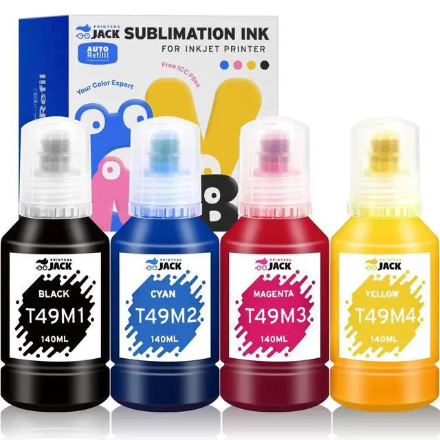 spills: Say goodbye to messy refills with our Auto-Fill & Auto-Stop feature. Simply slot our T49M sublimation ink bottles into your printer's ink inlet for automatic filling that stops on its own, preventing any spills or leaks. Spend less time on maintenance and more time creating! ^^ Exquisite Offering & Widely UsedPrinters Jack Sublimation Ink is versatile, ideal for creating intricate fonts, vibrant cartoon patterns, and designs on a variety of items such as T-shirts, pillowcases, mugs, masks, cross-stitch projects, caps, ceramics, banners, flip flops, tumblers, socks, canvases, puzzles, and more. Unleash your creativity to craft unique and personalized gifts for your loved ones. ^^ Certification & Life time supportISO-9001 and MSDS certified. Our sublimation ink undergo rigorous testing before delivery to ensure high quality, stability, and durability. Sublimation ink is suitable for fabrics with less than 30% cotton content. We are committed to providing efficient after-sales service to address any issues and ensure your satisfaction, elevate your printing game with our Sublimation Ink and enjoy the convenience of creating unique.