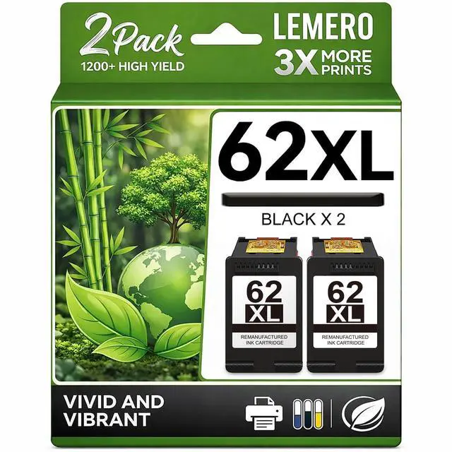 Package Contents: 2 Pack 62xl ink cartridges black Remanufactured Ink Cartridge Replacement for hp 62 black ink cartridge - 2 packs of large-capacity 62XL black.