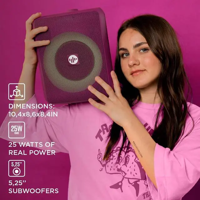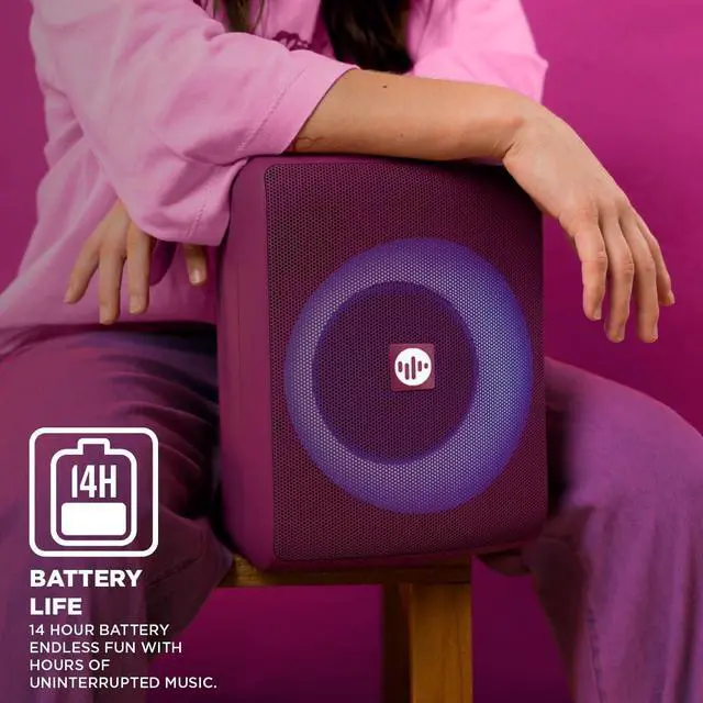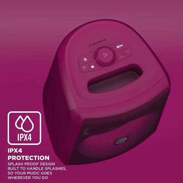 Its modern design includes RGB LED lights to enhance any occasion, while Bluetooth connectivity and AUX inputs make it highly functional. Available in elegant colors like green and purple, the Stromberg Chunk combines design, durability, and immersive sound in a compact and portable device. Turn any party into karaoke night with its included microphone ready to plug and play!