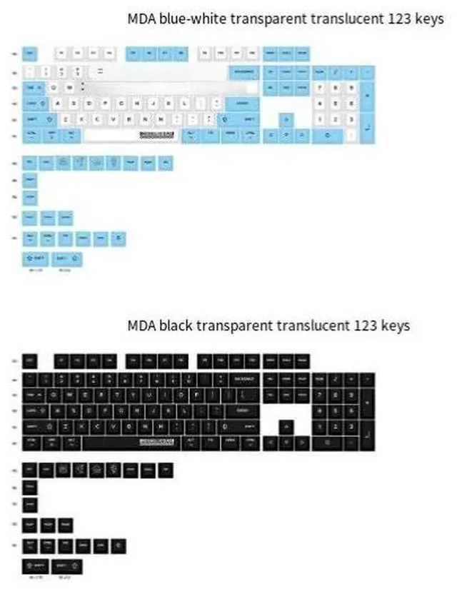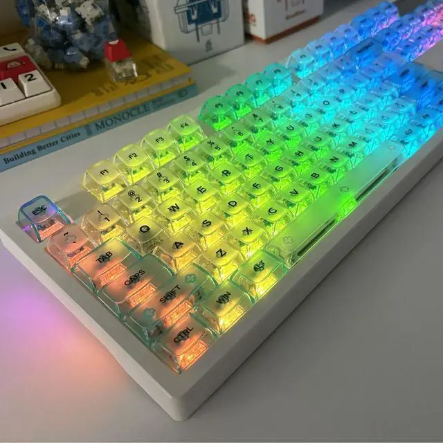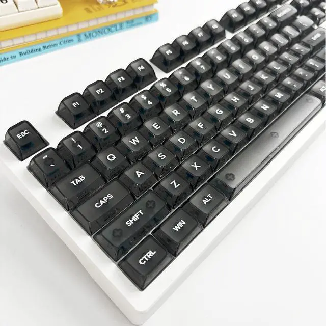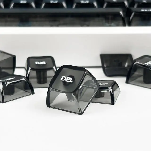 MDA transparent PC material keycaps with UV printing, engraved on the front side, matte on the surface, and with high gloss on all sides.