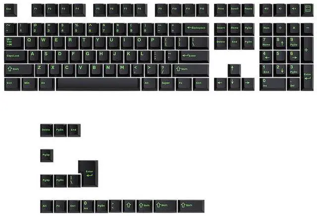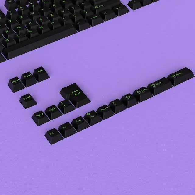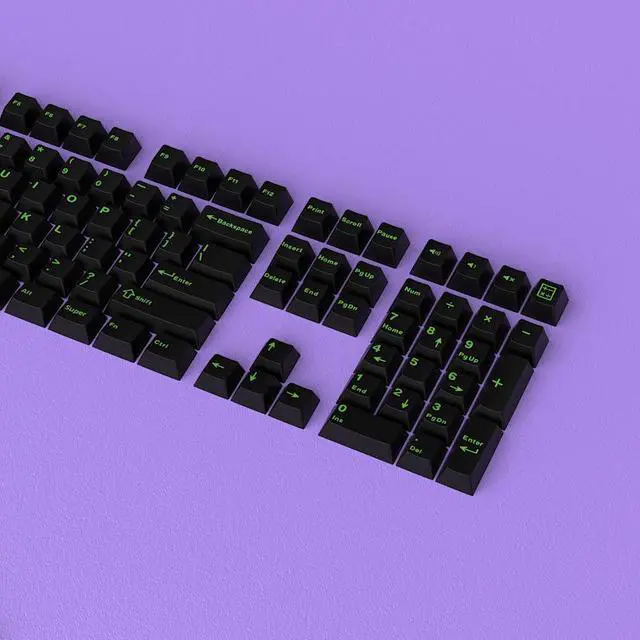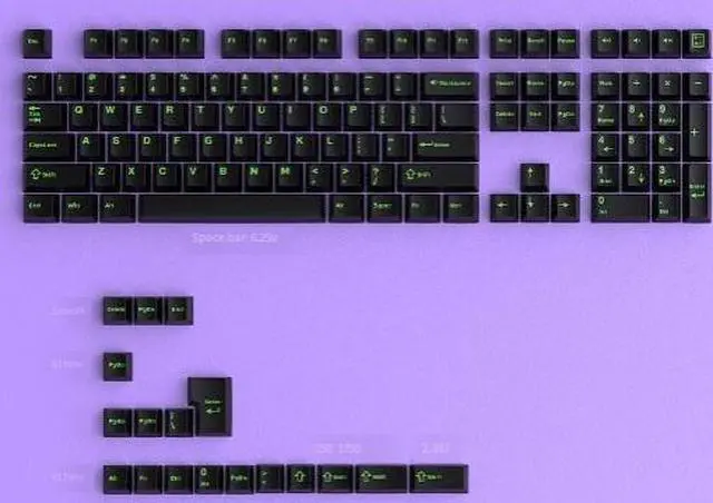 Black keycaps made of PBT material, engraved with a complete set of 126 keys, with dual color design.