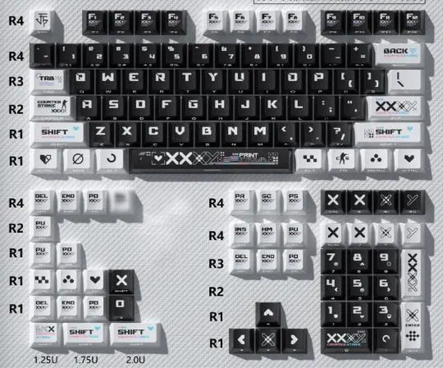 • 250-key -Black printed pattern with side-engraved design + PC transparent keycaps