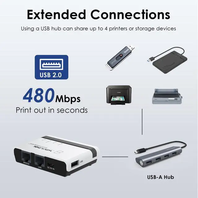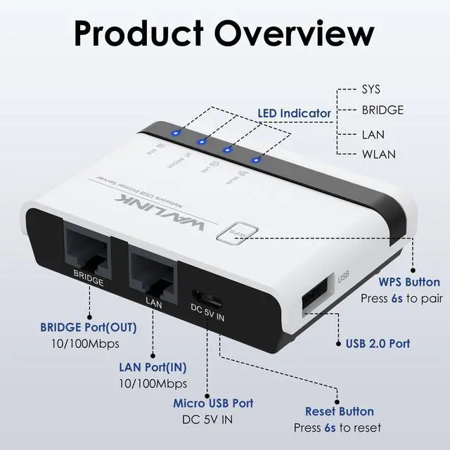 WAVLINK USB2.0 Wireless Printer Server with 10/100Mbps LAN/Bridge NU516U1