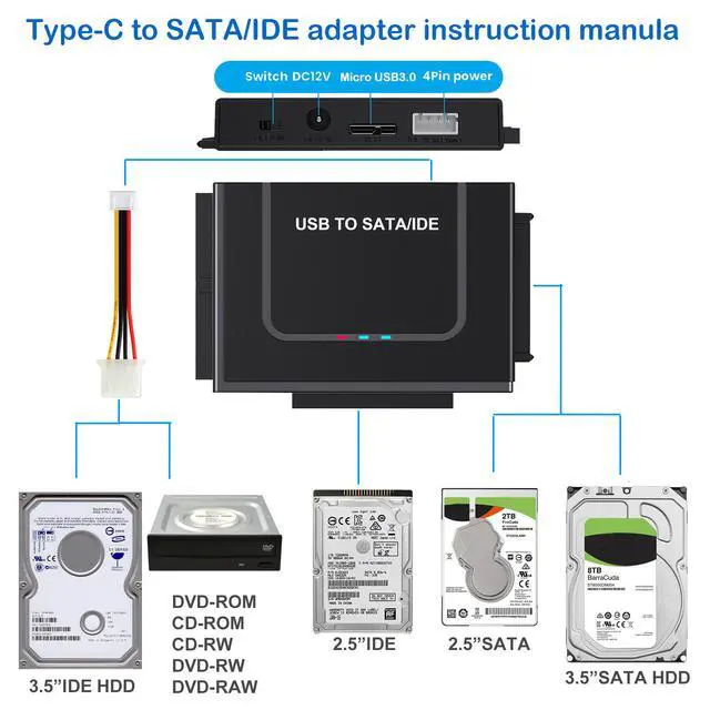 USB 3.0 to SATA/IDE adapter for hard drive connection and reading of 2.5-inch and 3.5-inch types, universal in nature