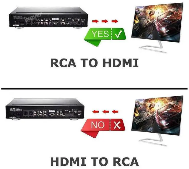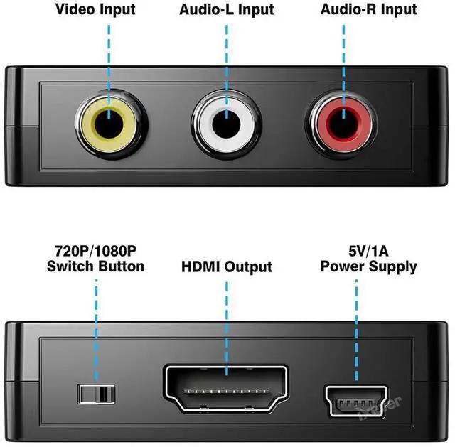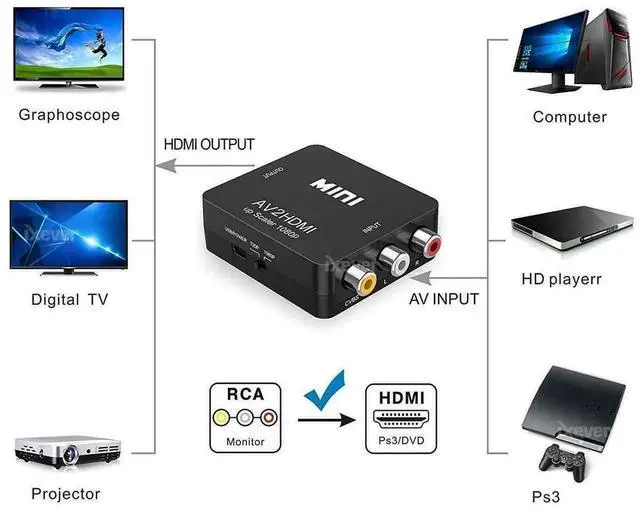 This RCA, CVBS, AV composite to HDMI converter, is a universal converter for analog composite input to HDMI 720p or 1080p (60Hz) output. You will be able to use your VCR, camcorder, or old game system display on your HDTV or HDMI monitor. This converter's advanced processing allowing you to get the clearest picture quality possible with optimal color and detail reproduction. Both video and audio are integrated into the HDMI output, providing an all-digital signal to maximize the fidelity of the audio and video.
