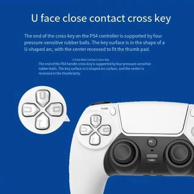 The end of the cross key on the PS4 controller is supported by fourpressure-sensitive rubber balls. The key surface is in the shape of aU-shaped arc, with the center recessed to fit the thumb pad.
