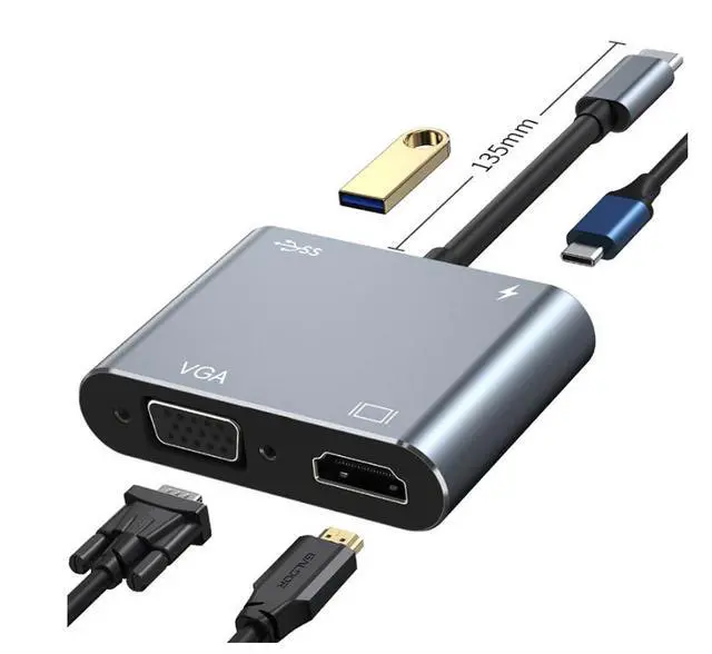 Type-C to HDMI, VGA, USB3.0 4-IN-1 Converter - Computer to Adapter for Laptop Projector
