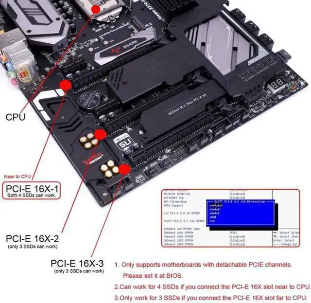 2.Only supports motherboards with detachable PCI-E channels.Control the operation of two disks based on the motherboard PCIE channel,The motherboard without PCIE signal split can only recognize one disk.
