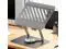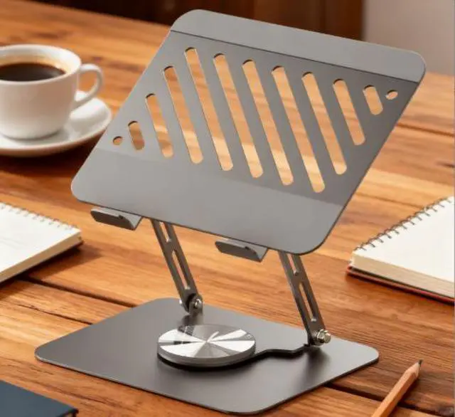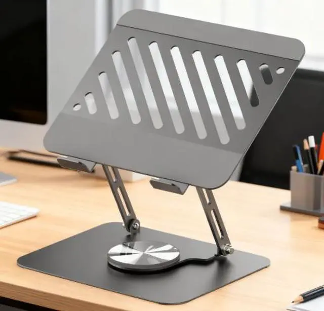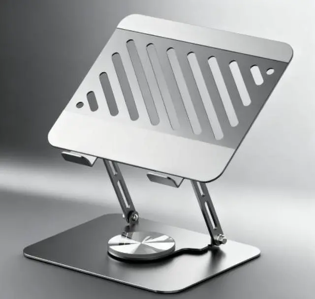 Computer stand that can be folded and adjusted for height, rotates 360 degrees and provides cooling for the laptop.