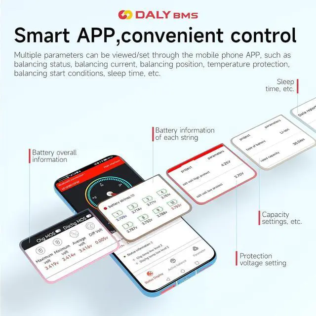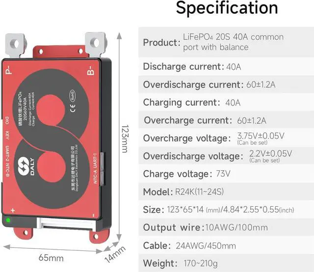 DALY BMS: protección contra sobrecarga; protección contra sobrecarga; protección contra sobrecorriente; protección contra cortocircuitos; protección de temperatura; protección impermeable.