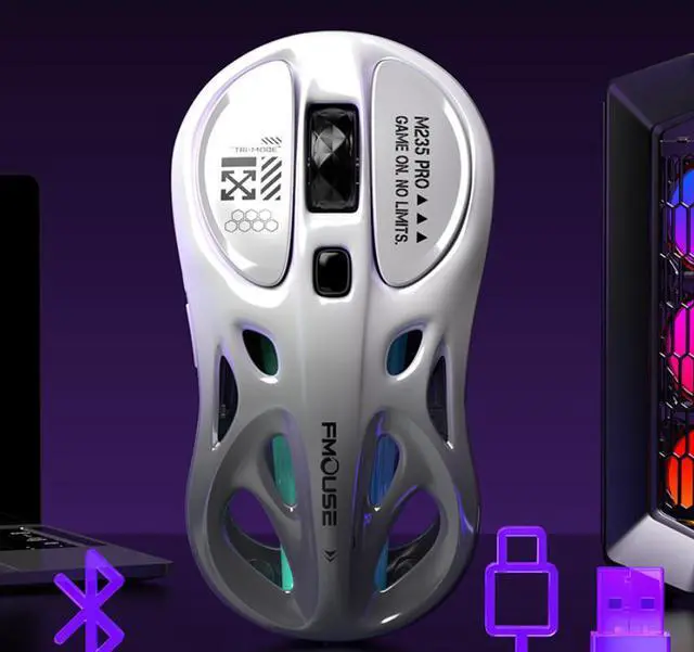 M235por is a lightweight three-mode wireless Bluetooth mouse for computers, featuring RGB lighting for gaming and esports purposes.