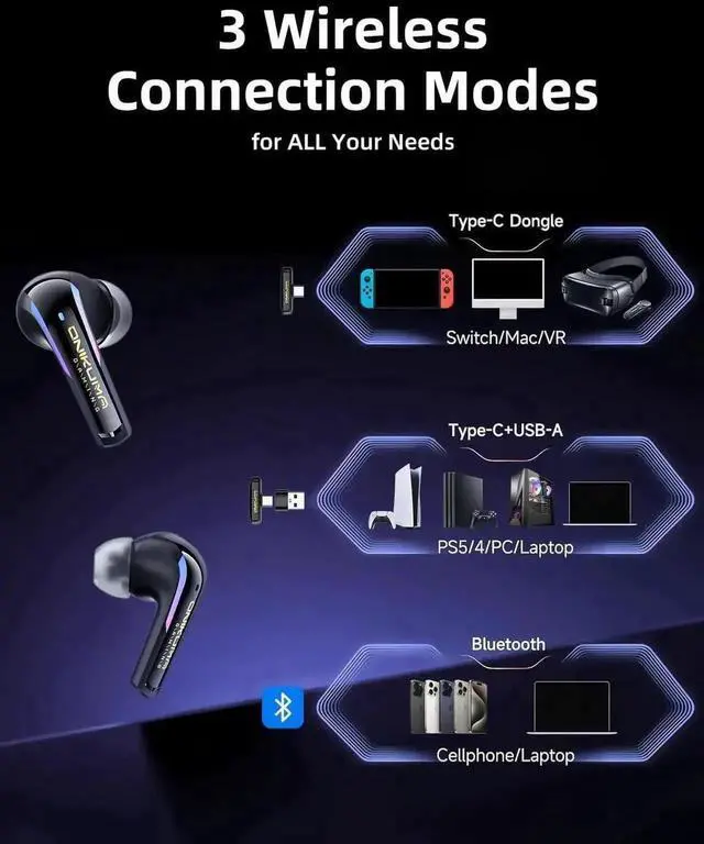 T27 true wireless gaming earbuds will bring synchronous sound, and experience VR gaming smoothly. T27 wireless earbuds are equipped with 2.4G wireless technology and 5.3 Bluetooth connectivity which can compatible with PC, PS4, PS5, VR headsets, Switch or other game consoles by USB dongle or 5.3 bluetooth.